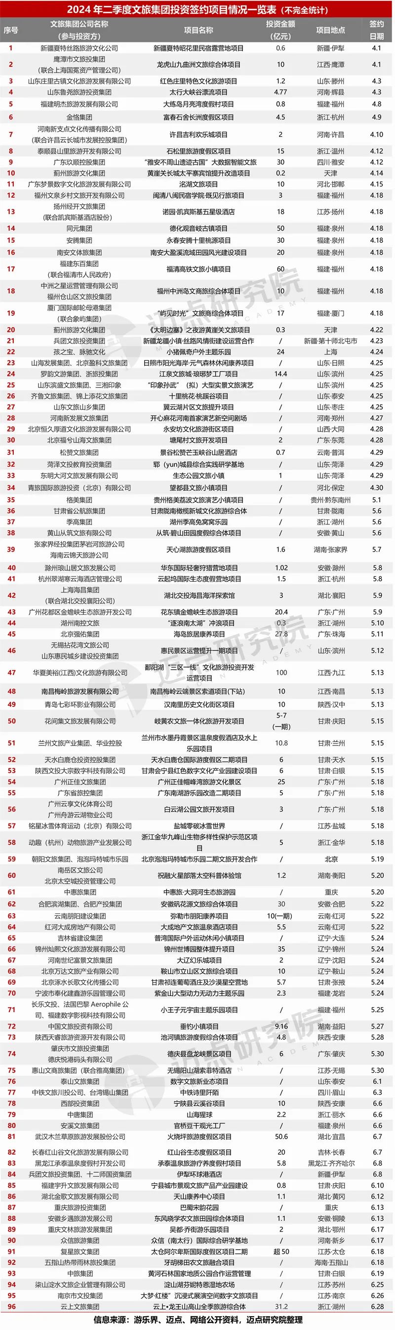 以文旅集团(公司)为投资主体,签约项目96个,其中公布投资金额的项目66个,合计约869亿元。单个项目投资额50亿元及以上的5个,具体为德化观音岐古镇项目(拟投资50亿元,同元集团投资)、福清高铁文旅小镇项目(总投资60亿元,福建东百集团投资)、太仓阿尔卑斯国际度假区项目二期(总投资超50亿元,复星旅文集团投资)、火烧坪旅游度假区项目(位于湖北宜昌长阳县,总投资50.6亿元,武汉木兰草原旅游发展股份有限公司投资)、鄱阳湖“三区一线”文化旅游投资开发运营项目(位于江西九江都昌县,建设范围涉及都昌县内112平方公里,总投资100亿元,华夏美裕文化旅游公司投资)。