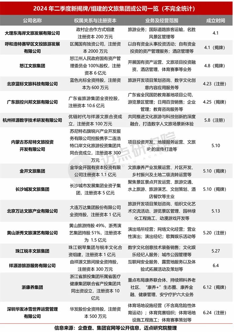 3. 新的文旅集团公司组建二季度,一方面以怒江文旅集团、长沙城发文旅集团、浙江康养集团等为代表的国企系文旅集团相继揭牌或注册成立,另一方面以北京蓝标文旅科技公司、北京万达文旅产业公司等为代表的民营公司设立,我国文旅集团的规模逐渐壮大、实力逐步增强、业务范围延伸、合作拓展深化。从大理东海岸文旅公司的“政村企合作组建”到内蒙古苏尼特文旅投资公司的“共同合资成立”再到数字人头部企业优链时代和祥源文旅合资成立“杭州祥源数字技术研发公司”、黄山浙秀文旅演艺公司的“共同投资设立”、珠江锐丰文旅集团的“合资组建”,这些“文旅合资公司”的纷纷成立反映了文旅产业的深度融合、跨界合作的特征与趋势,且具有资源整合、优势互补、提高市场竞争力及风险分担等优势。