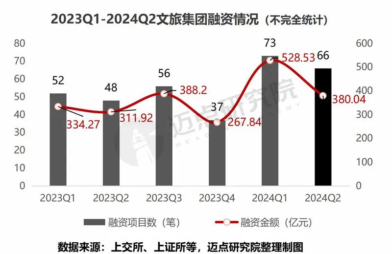 二季度文旅集团融资情况1. 融资规模据迈点研究院不完全统计,2024年二季度文旅集团融资项目(仅指已发行和通过)66项,项目数量同比2023Q2增长约37%,涉及37家文旅集团,融资金额总计380.04亿元,同比增长约22%(去年二季度为311.92亿元)。环比方面,则相对有所下降,融资交易阶段性放缓。