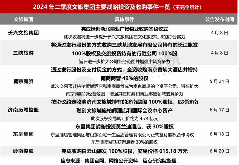 2. 文旅集团投资收购据不完全统计,二季度主要有6起代表性文旅投资收购事件,以股权收购为主要方式,聚焦实现战略布局、提升市场竞争力、扩大业务范围等目标,或“强强联合”或“大鱼吃小鱼”,促使文旅资产整合优化。长兴文旅集团:4月与深圳绿创投资集团完成绿创浙北商业广场的收购签约。此次收购,不仅利于提升集团在文化旅游领域的综合实力,也将为长兴县的商业繁荣和文化发展注入活力。三峡旅游:拟收购长江旅发100%股权及行胜公司100%股权,该交易事件已持续两年,目前交易标的公司员工安置、相关资产审计评估工作正在进行中。