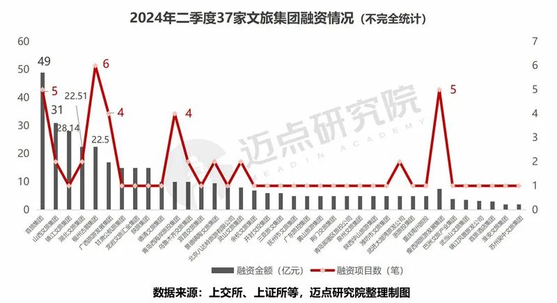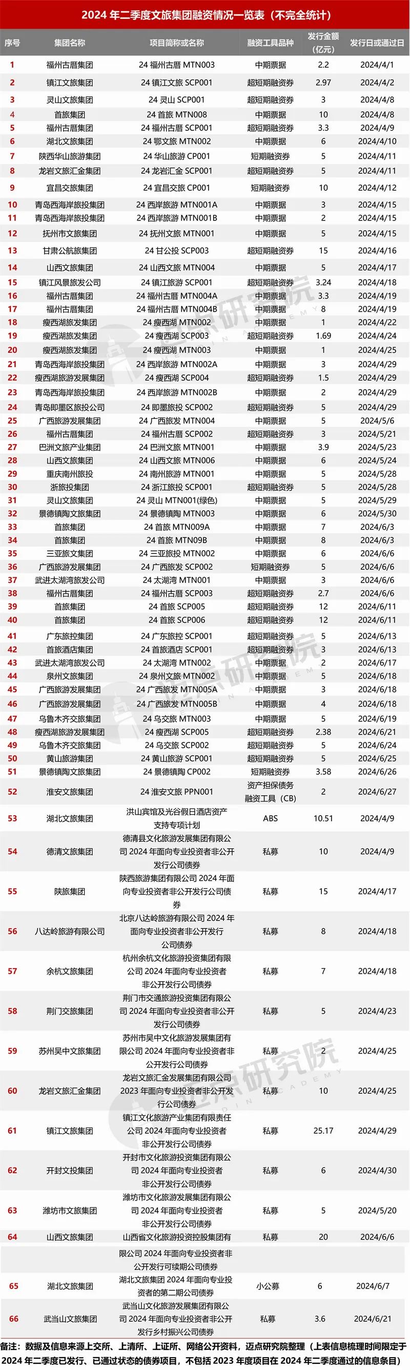 4.各文旅集团融资表现据迈点研究院不完全统计,2024年二季度共有37家文旅集团发起并完成融资事项,其中首旅集团融资金额最高,为49亿元;福州古厝集团融资项目数最多,共6笔。除上述两家文旅集团外,山西文旅集团、镇江文旅集团、湖北文旅集团这3家集团本季度融资金额均超20亿元;瘦西湖旅游发展集团、广西旅游发展集团、青岛西海岸旅投集团融资项目数则均有4笔及以上。首旅集团:融资项目5笔(3笔中期票据、两笔超短期融资券),融资金额49亿元。环比一季度,无论是项目数还是金额均呈下降趋势。从其一季度财务报告数据可知,2024Q1净利润-3.05亿元,为亏损状态,面临承债压力。