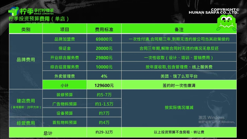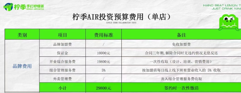 据柠季官方客服提供的资料,开店初期资金约29-32万元(不包含房租、转让费)。其中,品牌费用总计129,600元(包括加盟费69800元;开业综合服务费29800元;综合运营服务费10000元/年;外卖管理费4%/年,以及保证金20000元),需在签约时一次性缴纳。