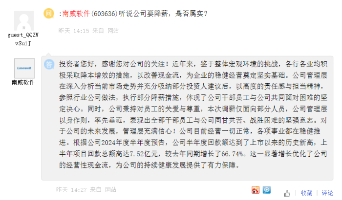 南威软件回应称:“近年来,鉴于整体宏观环境的挑战,各行各业均积极采取降本增效的措施,以改善现金流,为企业的稳健经营奠定坚实基础。公司管理层在深入分析当前市场走势并充分吸纳部分投资人建议后,以高度的责任感与担当精神,参照行业公司做法,执行部分降薪措施,体现了公司干部员工与公司共同面对困难的坚定决心。”