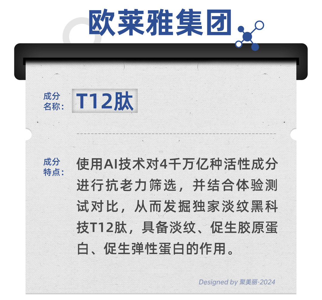 官方介绍,欧莱雅集团在挖掘这一成分的过程中,采用AI技术针对4千万亿种活性成分进行筛选,并通过体验测试,挖掘抗老力最好的T12肽。