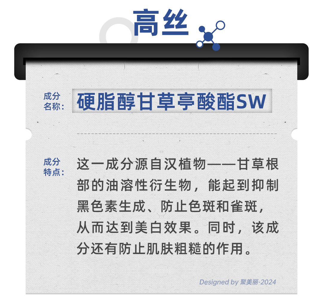 高丝称,这一成分是与丸善制药株式会社的共同研究所得,双方基于硬脂醇甘草亭酸酯的抗炎症作用,探究抑制该刺激传递、带来美白效果的可能性,现通过双盲实验证实可抑制黑色素沉积。