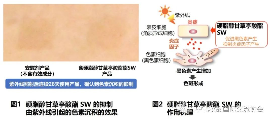硬脂醇甘草亭酸酯SW作用机理则是,色斑因暴露紫外线,导致表皮细胞中的炎症因子之一的前列腺素E2(PGE2)增加,并转化为激活黑色素细胞,而这一成分本身具有抗炎症作用,并抑制炎症因子产生,发挥美白功效。