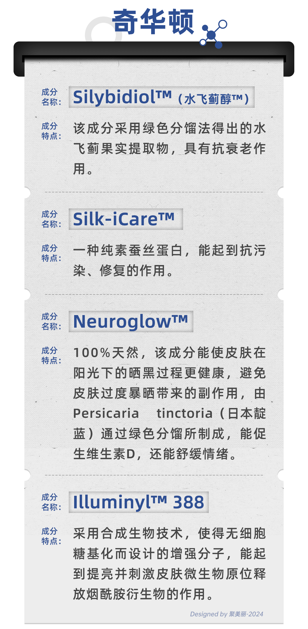 据聚美丽不完全统计,今年上半年,奇华顿共推出4个新成分,分别是Silybidiol (水飞蓟醇 )、Silk-iCare 、Neuroglow 和Illuminyl 388。