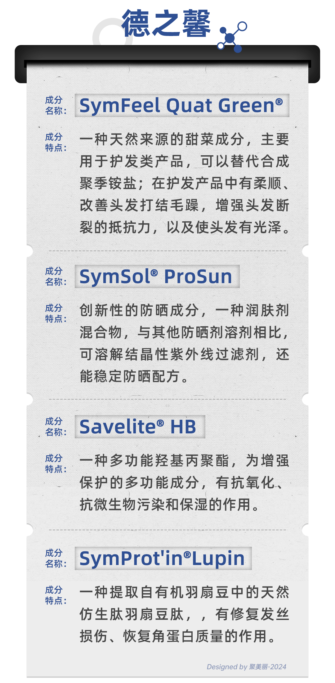 与奇华顿不同的是,徳之馨把洗护成分作为关注的一大领域,SymFeel Quat Green 和SymProt'in Lupin为新推的护发成分。