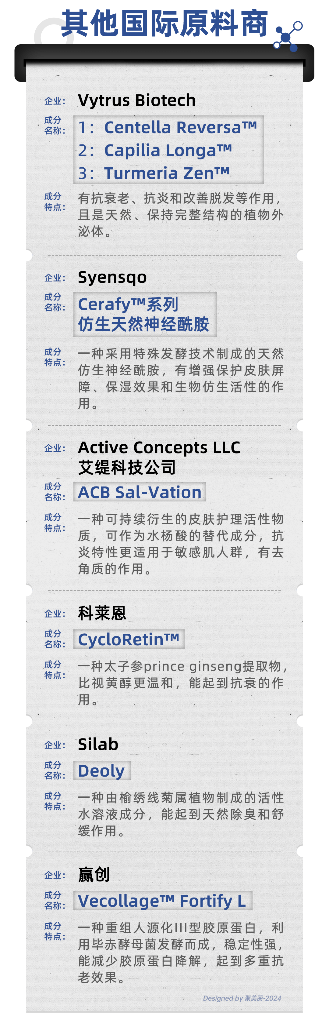 此外,其他国际原料商也有推出重组胶原蛋白、植物泌外体等新成分,篇幅有限这里不再赘述。