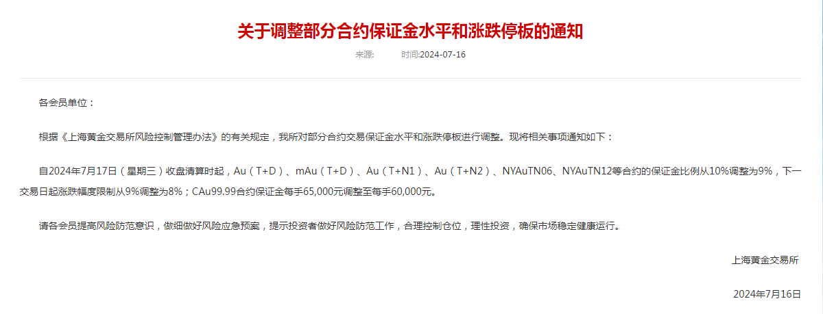 上海黄金交易所网站7月16日公告,自7月17日收盘清算时起,Au(T+D)、mAu(T+D)、Au(T+N1)、Au(T+N2)、NYAuTN06、NYAuTN12等合约的保证金比例从10%调整为9%,下一交易日起涨跌幅度限制从9%调整为8%。CAu99.99合约保证金每手65,000元调整至每手60,000元。