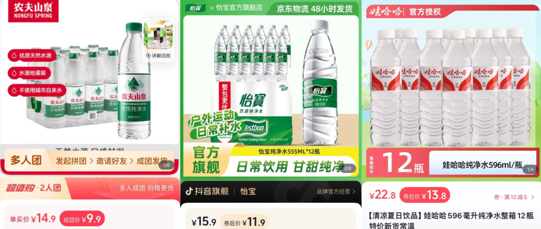 从线上的售价来看,怡宝、娃哈哈的降价动作不如农夫山泉激进。以抖音商城为例,12瓶农夫山泉绿瓶纯净水的成团价为9.9元,12瓶怡宝纯净水的券后价为11.9元,娃哈哈授权店给出的12瓶纯净水券后价则为13.8元。