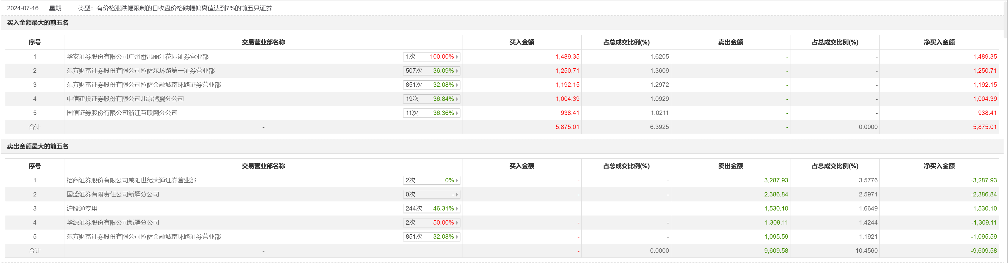 根据公司7月16日盘后龙虎榜显示,华安证券股份有限公司广州番禺丽江花园证券营业部处于买一位置,净买入1489.35万元。而“拉萨帮”散户分别出现在买二、买三和卖五席位。