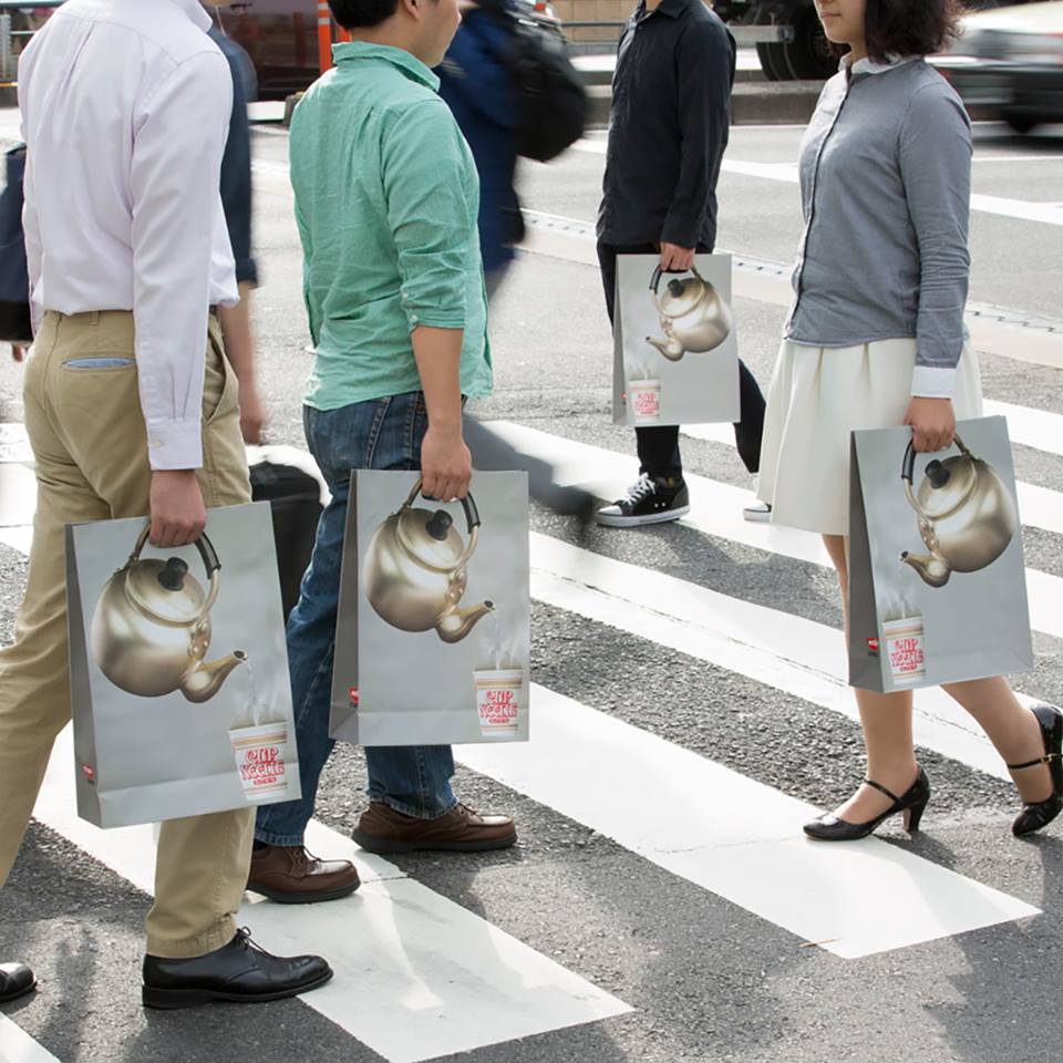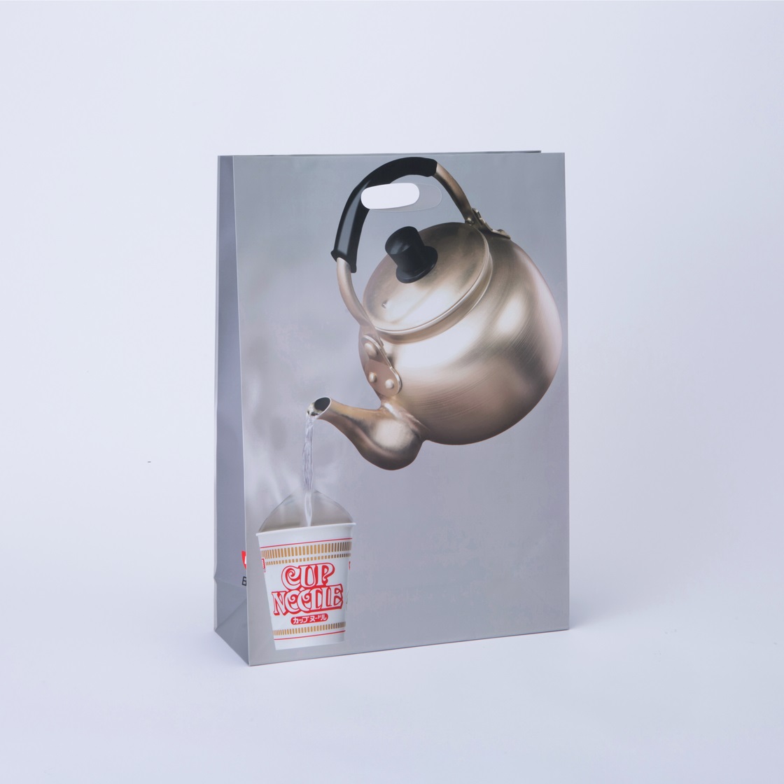 最初这个纸袋是一个泡面爱好者设计、并投稿在日清杯面的Facebook页面中的,因为网友反响热烈,日清在去年10月将这个神奇设计正式商品化贩卖。