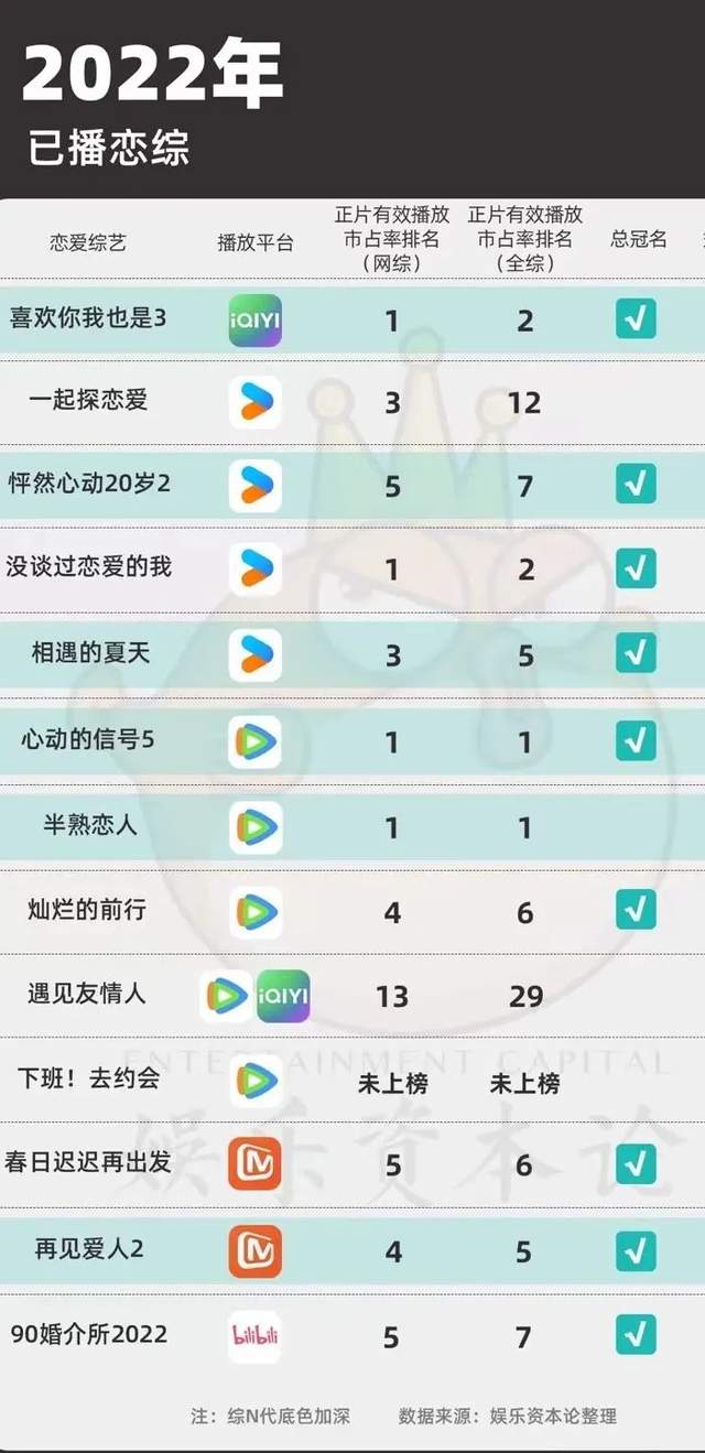 2022年,全网有13档恋综上线,腾讯上线5档,优酷4档,芒果tv两档,爱奇艺和bilibili各一档恋综。