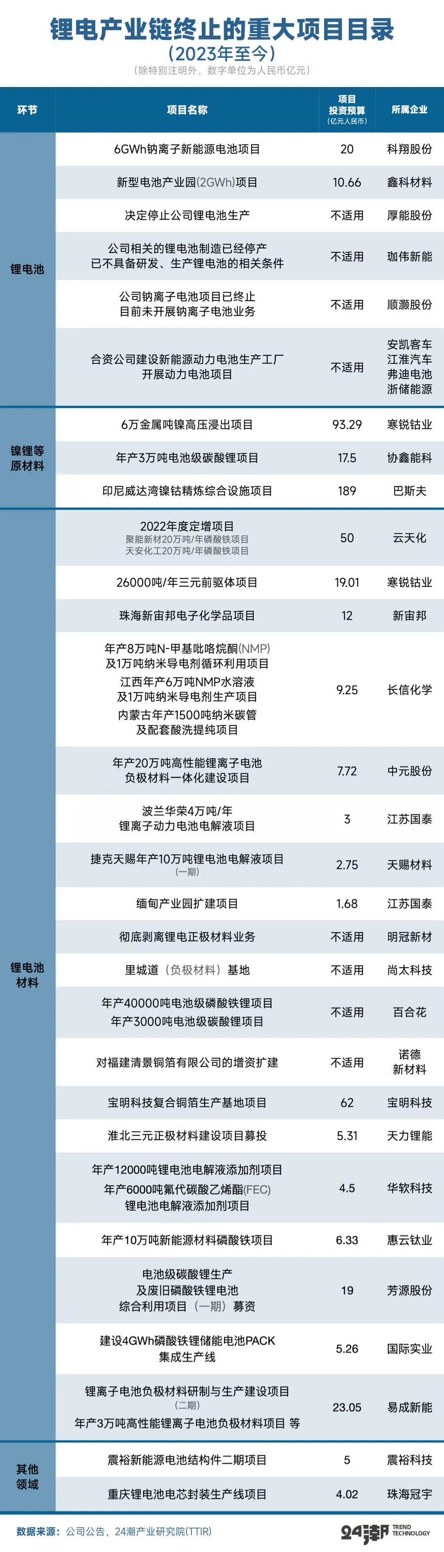 24潮团队分析发现,随着产业形势的严峻变化,锂电大退潮迹象还在进一步延伸、扩大。
