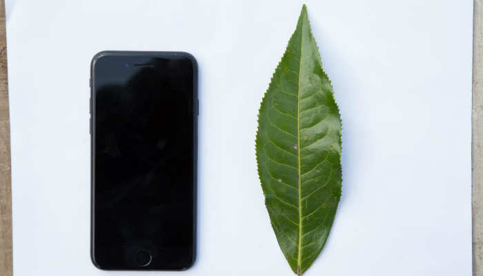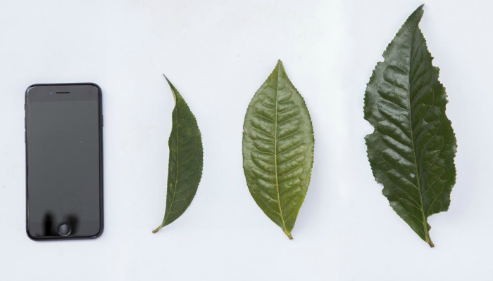 (左为iPhone7,右为“柳叶眉”茶树鲜叶。采摘自老班章村百年以上古茶树)