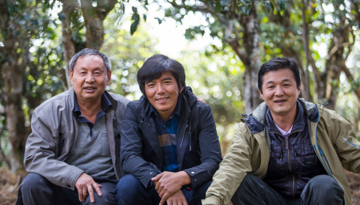 (左一为原茶科所所长王平盛、左二为老班章原住民二土、左三为茶语茗星“春辰茶庄”创始人胡锦明)