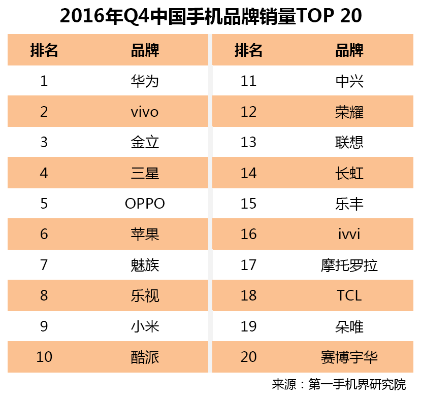 华为、vivo、金立、三星、OPPO、苹果、魅族、乐视、小米、酷派成为2016年第四季度中国手机品牌销量TOP 10。