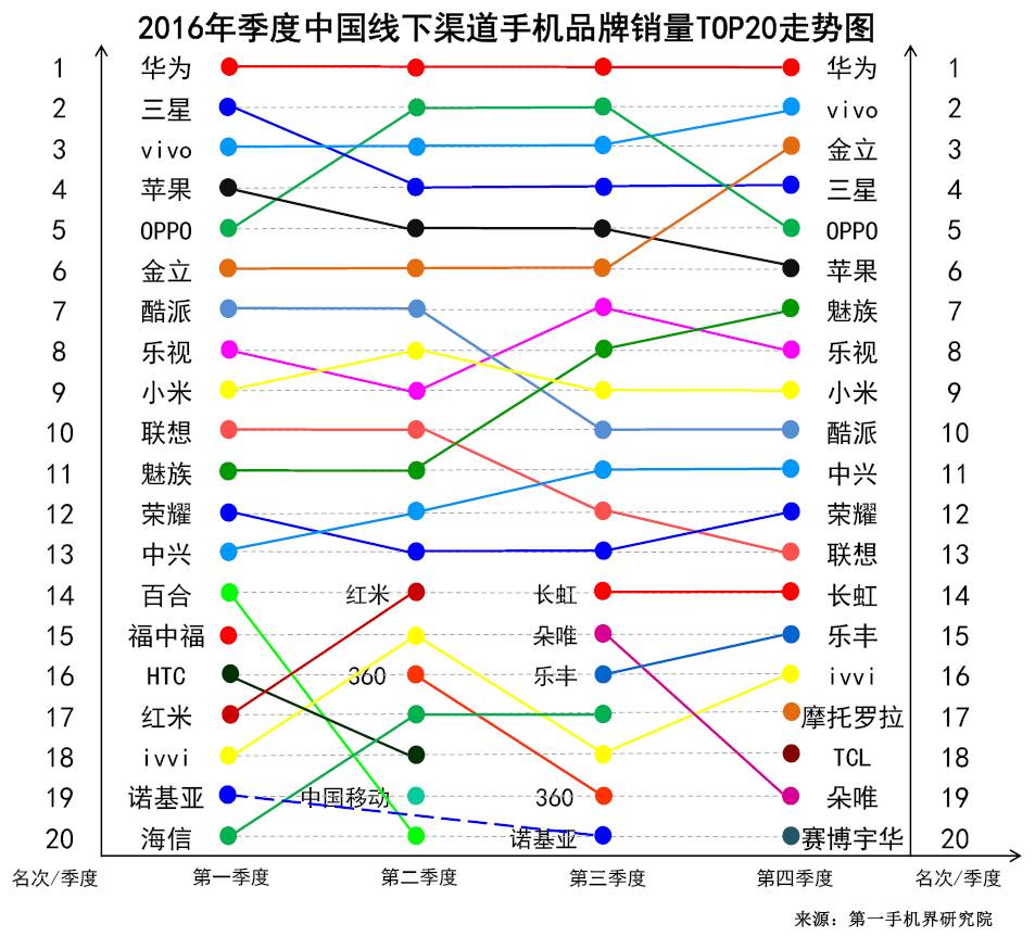 根据迪信通、七星手机连锁、浙江话机世界、广西王者通讯、四川龙翔通讯、广东丽的通讯、广东新星源手机数码连锁、金佳信、黑龙江省凌志手机连锁、海南王者天创、山西太通科技、山西远大通讯、湖南齐欣通讯、江西丽华通讯、湖北九鼎通讯、吉林天天手机、云南九机网、甘肃悦达、陕西中人、河南兄弟通讯商会、河南国宇、河南胜天、江苏国网、河北润德、厦门中桥、贵州诚讯等全国手机连锁卖场销售数据统计结果显示,2016年第四季度在中国线下渠道销售的手机品牌达到122个,环比Q3增长了15%;有一定销量的手机机型达到139款,环比Q3的134个,增长了4%。