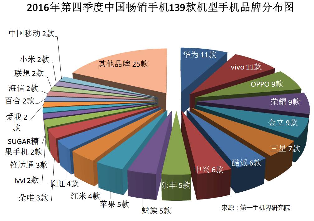2016年Q4在中国线下渠道走量的139款手机机型基本分布是, 华为11款、vivo 11款、OPPO9款、荣耀9款、金立9款、三星7款、酷派6款、中兴6款、乐丰5款、魅族5款、苹果5款、红米4款、长虹4款、朵唯3款、锋达通3款、ivvi2款、SUGAR糖果手机2款、爱我2款、百合2款、海信2款、联想2款、小米2款、中国移动2款,剩下的就是其它品牌。