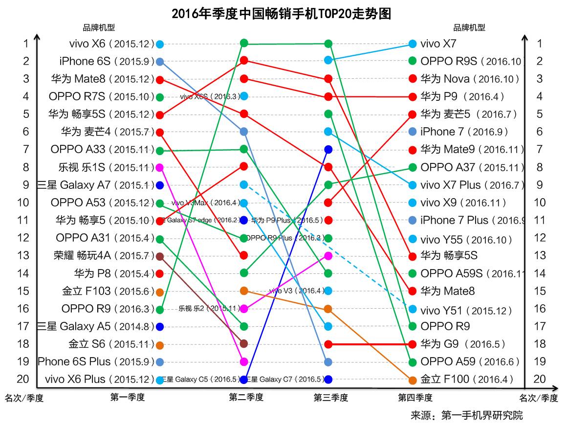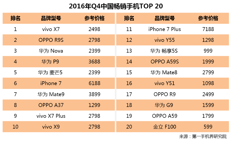 vivo X7、OPPO R9S、华为Nova、华为P9 、华为麦芒5 、iPhone 7、华为Mate9、OPPO A37、vivo X7 Plus、vivo X9成为2016年第四季度中国畅销手机TOP 10。
