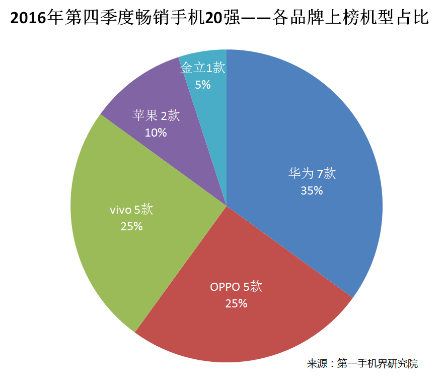 2016年第四季度中国畅销手机TOP 20中,华为有7款、OPPO有5款、vivo有5款、苹果有2款、金立有1款机型。