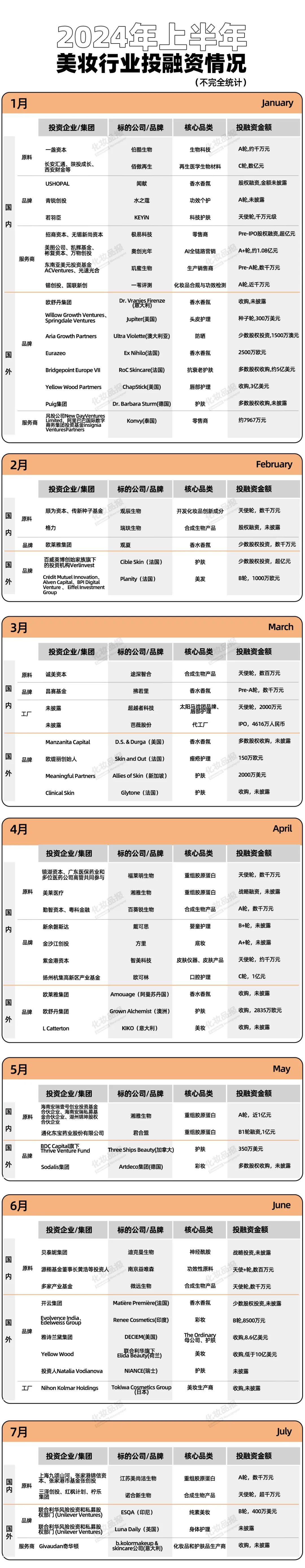据《化妆品报》不完全统计,截至7月15日,2024年上半年化妆品行业国内外投融资事件已达58起,其中国内市场30起,国际市场28起,包含化妆品原料、品牌、服务商、工厂等多领域。从已披露的金额来看,上半年美妆投融资活动涉及资金已超221亿元。