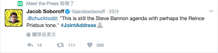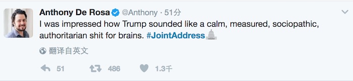 《卫报》记者本·雅各布斯(Ben Jacobs)评论说:“唐纳德·特朗普周二的演讲中最令人震惊的地方是,根本没有值得震惊的料。”
