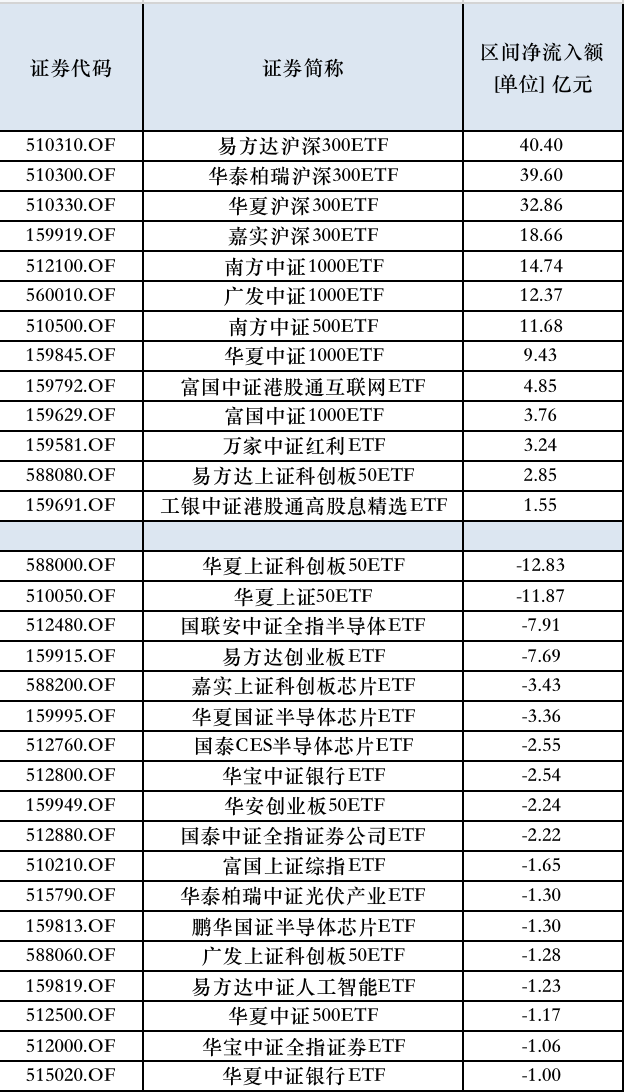 易方达沪深300ETF、华泰柏瑞沪深300ETF净流入额在40亿元上下,华夏沪深300ETF净流入额达到32亿元,嘉实沪深300ETF净流入额达到18亿元。