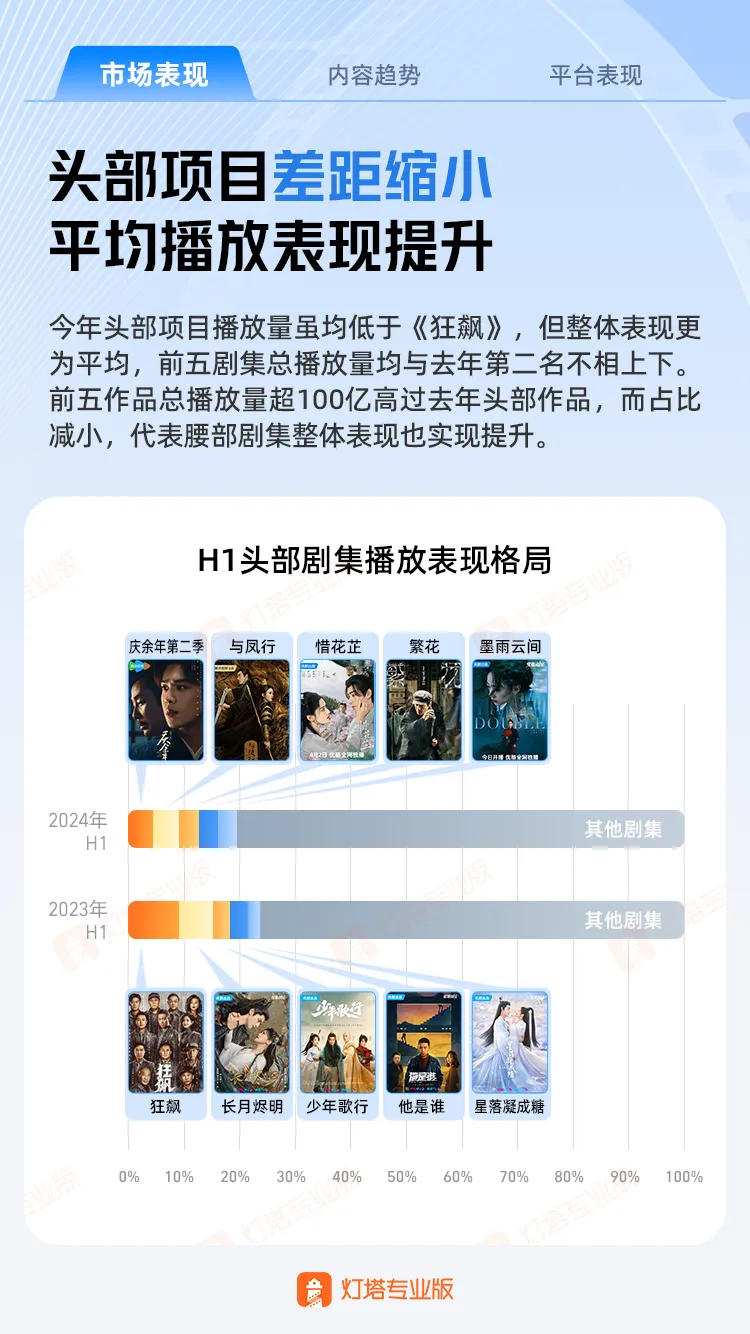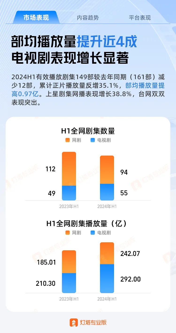 2024年过半,影视行业的持续火热。古装、年代、都市等主流赛道佳作频出,多元类型剧集各展风采。6月26日,影视数据平台灯塔专业版发布《2024 H1(上半年)剧集市场洞察报告》。数据显示,上半年剧集部均播放量提升近40%,各类型赛道创新内容不断涌现,各大平台独播剧总播放量均较同期实现增长。灯塔数据显示,2024上半年有效播放剧集共计149部,相较于去年同期的161部减少了12部,但累计正片播放量却逆势增长35.1%,部均播放量提升了0.97亿。