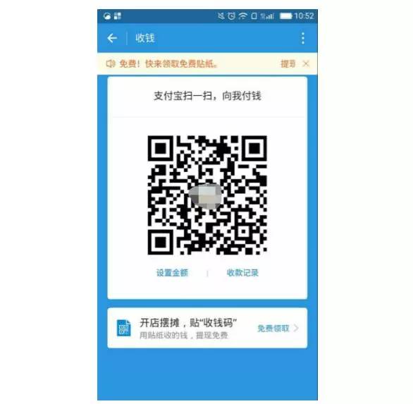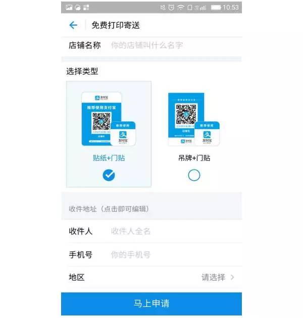 对于商户来说,可以点击下方的免费领取支付宝“收钱码”贴纸。申请之后,支付宝方面将免费打印并寄送到家。贴纸分为“吊牌”和“贴纸”两种形式,支付宝显示,在店内通过贴纸或吊牌收钱,收钱和提现都是免费的。