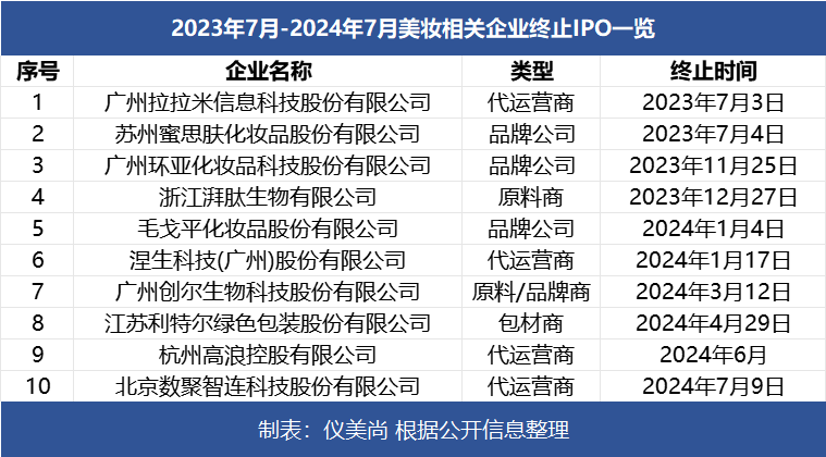 据仪美尚不完全统计,在2023年7月至2024年7月这一年间,有10家美妆相关企业终止了IPO,其中包括4家TP服务商,占比近半数。