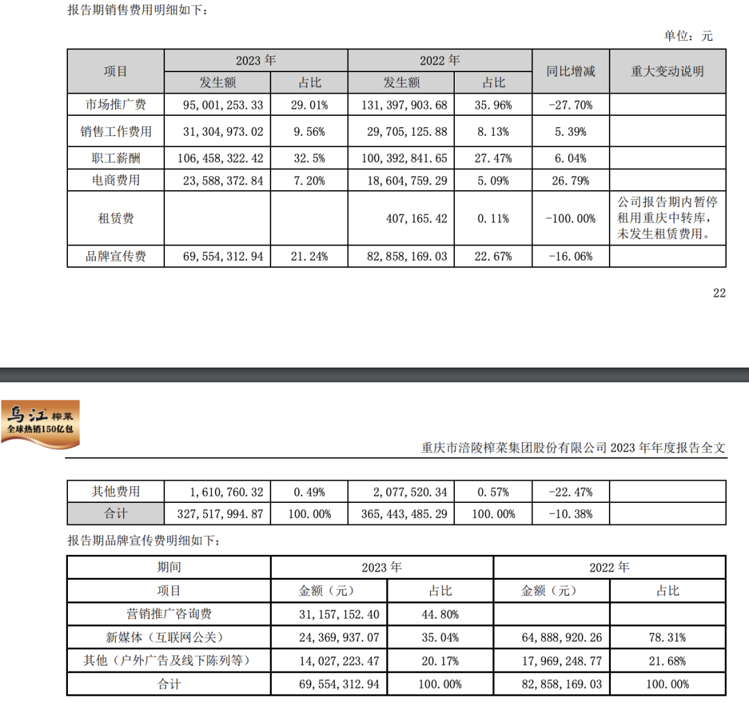 2021年之后,品牌宣传费用开始骤减,2023年涪陵榨菜的品牌宣传费用从2亿多变成了7000万。其中品牌宣传费用中,营销推广咨询费3116万、新媒体(互联网公关)2437万元、户外广告等其他费用1403万元。