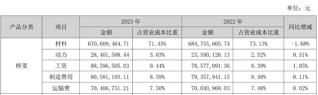 我们以2023年涪陵榨菜的营收成本情况来计算,榨菜类营收20.76亿元占比85%,而榨菜类产品2023年成本9.39亿元,其中材料成本6.7亿元,占营收成本的比重高达71.45%。