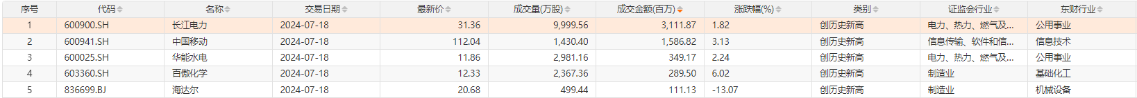 今日长江电力、华能水电、中国移动等5只个股股价创历史新高