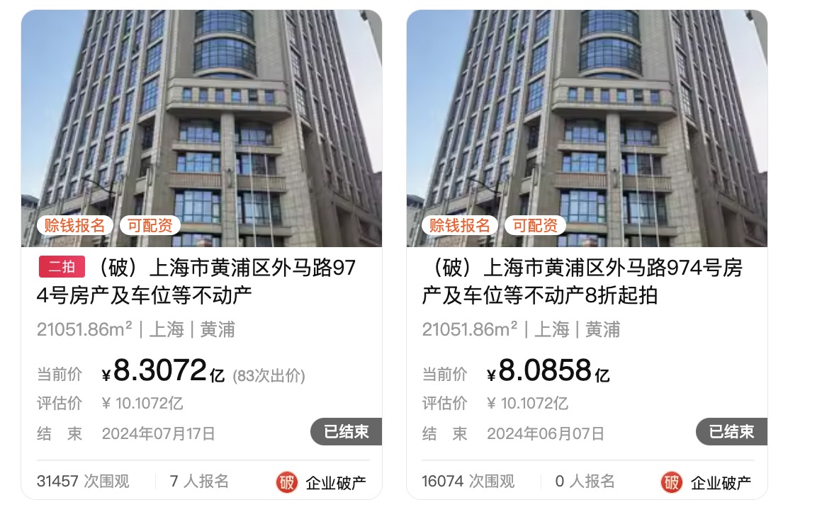 具体而言,7月16日至17日,上海市第三中级人民法院在阿里拍卖平台对上海市黄浦区外马路974号房产及车位等不动产进行公开拍卖,起拍价为7.2772亿元,7名买家报名参拍,经过83轮出价,上海万栊商业管理有限公司拿下了该标的物。