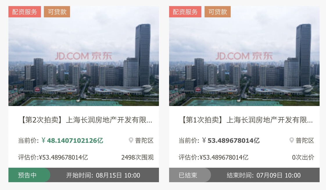 京东资产交易平台显示,7月9日,上海长润房地产开发有限公司、上海江和房地产开发有限公司持有的上海长润江和房地产发展有限公司40%股权因无人出价而流拍,起拍价约53.49亿元,其间共2人报名,12277人围观。