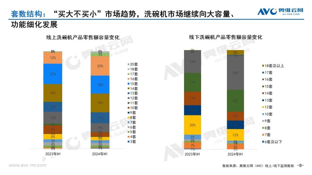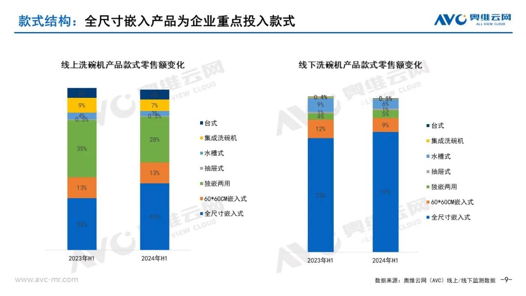 从套数与款式结构变化来看:全尺寸、大容量嵌入式洗碗机占比继续提升,奥维云网(AVC)监测数据显示,2024年上半年线上、线下市场主销容量皆为16套洗碗机,线上市场16套容量洗碗机销售额占比20%,同比提升8%。线下市场16套容量洗碗机销售额占比34%,同比提升11%。从销售款式类型来看,2024年上半年线上、线下市场主销产品款式皆为全尺寸嵌入式款,线上市场全尺寸嵌入式款洗碗机销售额占比41%,同比增长9%;线下市场全尺寸嵌入式款洗碗机销售额占比77%,同比增长4%;市场继续向大容量、功能细化发展。