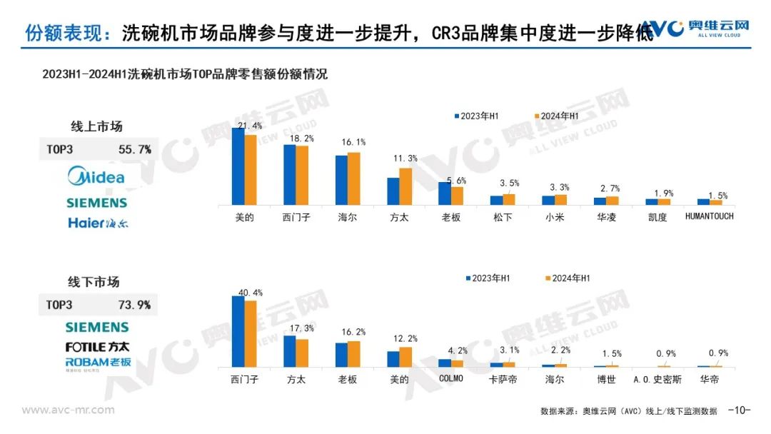 各品牌市场份额表现:2024年洗碗机市场企业参与度进一步提高,竞争也进一步加剧,奥维云网(AVC)监测数据显示,洗碗机线上市场CR3品牌占比55.7%,同比减少1.4%,海尔、方太、松下、小米、华凌等品牌市场份额有所提升。线下市场CR3品牌占比73.9,同比减少3.9%,老板、美的、卡萨帝、海尔、博世、A.O.史密斯、华帝等品牌市场份额有所提升。