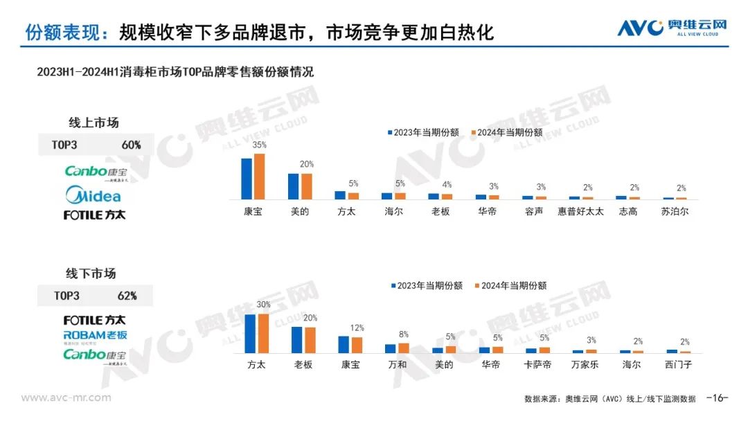 各品牌市场份额表现:2024年消毒柜市场竞争进一步加剧,长尾品牌逐步退出市场,市场竞争更加白热化。奥维云网(AVC)监测数据显示,消毒柜线上市场垂直专业品牌康宝继续领跑市场,占比达到35%,同比提升3%。线下市场综合厨电品牌方太、老板领跑市场,份额占比30%和20%,万和、卡萨帝在线下市场也取得较好增长。
