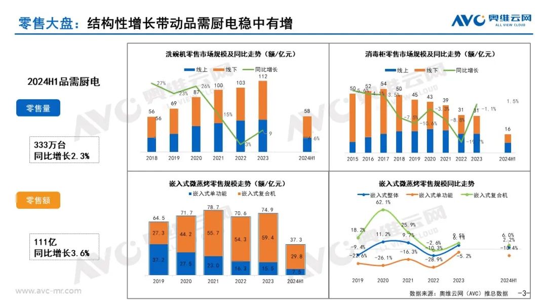 中国家电市场已经走过了快速增长和高质量增长期,整体家电行业进入了以产品迭代升级为主的慢增长周期,奥维云网(AVC)推总数据显示,2024年中国家电零售市场规模将达到8222亿元,其中品需类电器市场将保持稳步增长,洗碗机、嵌入式微蒸烤作为品需类电器代表增速明显,零售额同比预计增长4.3%和3.8%。