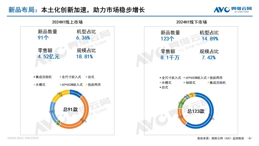 从新品布局来看:今年也许并非洗碗机市场增长的大年,确是洗碗机相关技术突破创新的“大年”,2月老板电器获得一项洗碗机喷淋臂实用新型专利,3月格力公布一项洗碗机存储控制方法专利,此外还有海尔申请的洗碗机排水装置实用新型专利,华帝为避免存放餐具弯腰而设计的下碗篮升降控制专利等。洗碗机在中国本土化创新方面,走出了新高度。奥维云网(AVC)监测数据显示,2024年洗碗机线上市场新品数量91个,零售额4.5亿元,新品销售规模占比提升1.2%;线下新品数量123个,零售额8千万,新品销售规模占比提升4.2%。