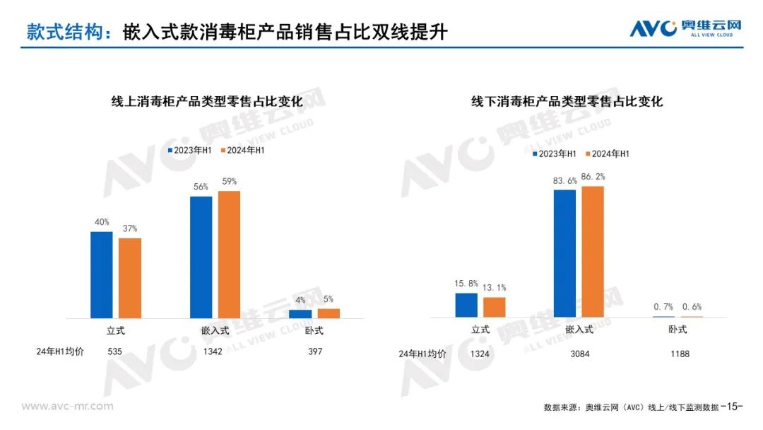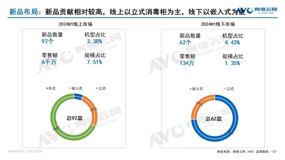从新品布局来看:2024年消毒柜线上市场新品数量92款,零售额6千万,新品销售规模占比提升2.36%。线下市场新品数量62款,零售额134万,新品销售规模占比减少1%。线上新品以立式款为主,新品占比68%.线下新品以嵌入式款为主,新品占比74.19%。从上市新品来看,产品更注重安全及聚焦母婴群体。