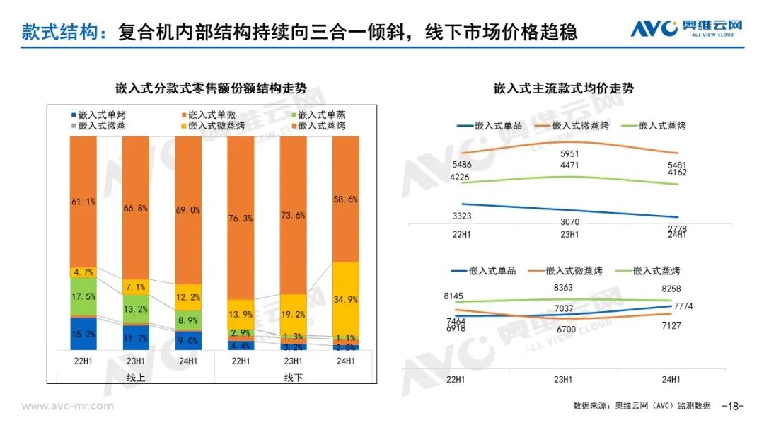 从产品结构看:复合型三合一产品渗透加速,线上市场开始“内卷”价格。分类型看,根据奥维云网(AVC)监测数据,2024年上半年线上市场嵌入式蒸烤产品零售额占比69%,较同期增长2.2%;线下市场嵌入式蒸烤产品零售额占比58.6%,较同期减少15%;嵌入式微蒸烤复合产品渗透加速,据奥维云网(AVC)监测数据,2024年上半年线上市场嵌入式微蒸烤复合产品零售额占比12.2%,较同期增长5.1%。线下市场嵌入式微蒸烤复合产品零售额占比34.9%,较同期增长15.7%。嵌入式单功能产品零售额份额占比进一步收窄,短期内仍处于下滑区间。