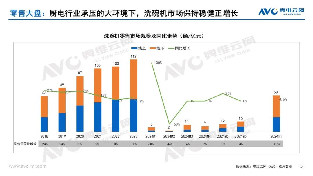 受到整体市场需求放缓,消费信心低迷,我国房地产市场又处于调整震荡期的影响,进入2024年以来,被大众寄予厚望的洗碗机市场并没有取得更高速的增长,但依旧延续了稳步正增长的行情。奥维云网(AVC)推总数据显示,2024年上半年洗碗机市场零售额规模58亿元,同比增长4.6%。零售量规模99万台,同比增长3.5%;随着企业资源的不断投入及产品创新加速,预计2024年下半年洗碗机市场依然会保持稳定增长。