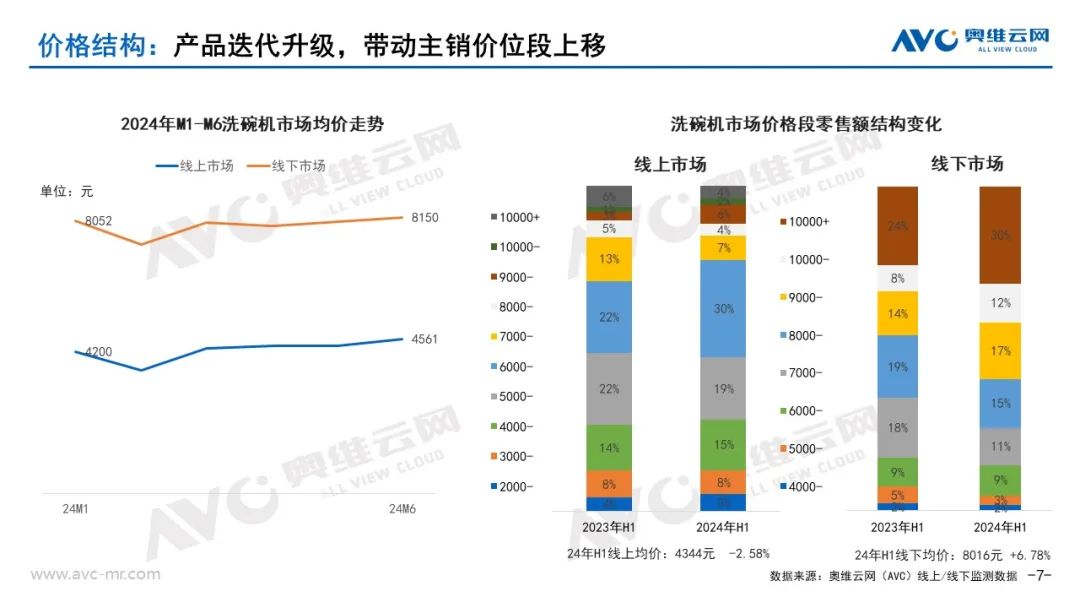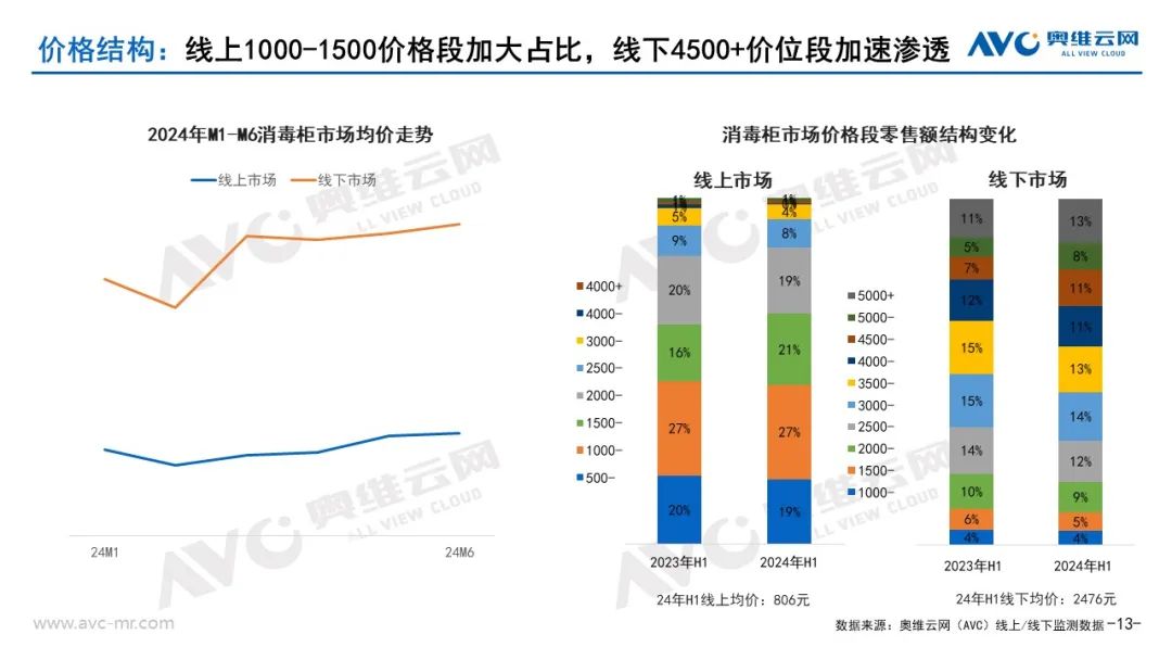 从价格段结构变化来看:2024年上半年消毒柜产品线上、线下市场均价都有所提升,线上以2000元内价格段产品销售为主,占比达到67%。其中1000-1500价位段产品销售额占比提升最快,提升5%。线下市场高价位段产品渗透加速,4000-5000价位段销售额占比提升最快,提升7%。