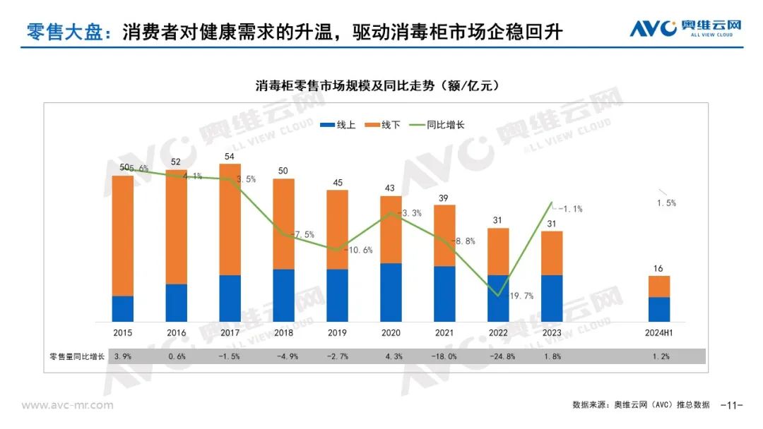 随着消费者对健康生活的追求和对消毒产品的需求增加,消毒柜市场规模逐渐触底反弹。奥维云网(AVC)推总数据,2024年上半年消毒柜零售额16亿元,同比增长1.5%;零售量173万台,同比增长1.2%,行业整体趋势平稳,持续向好。