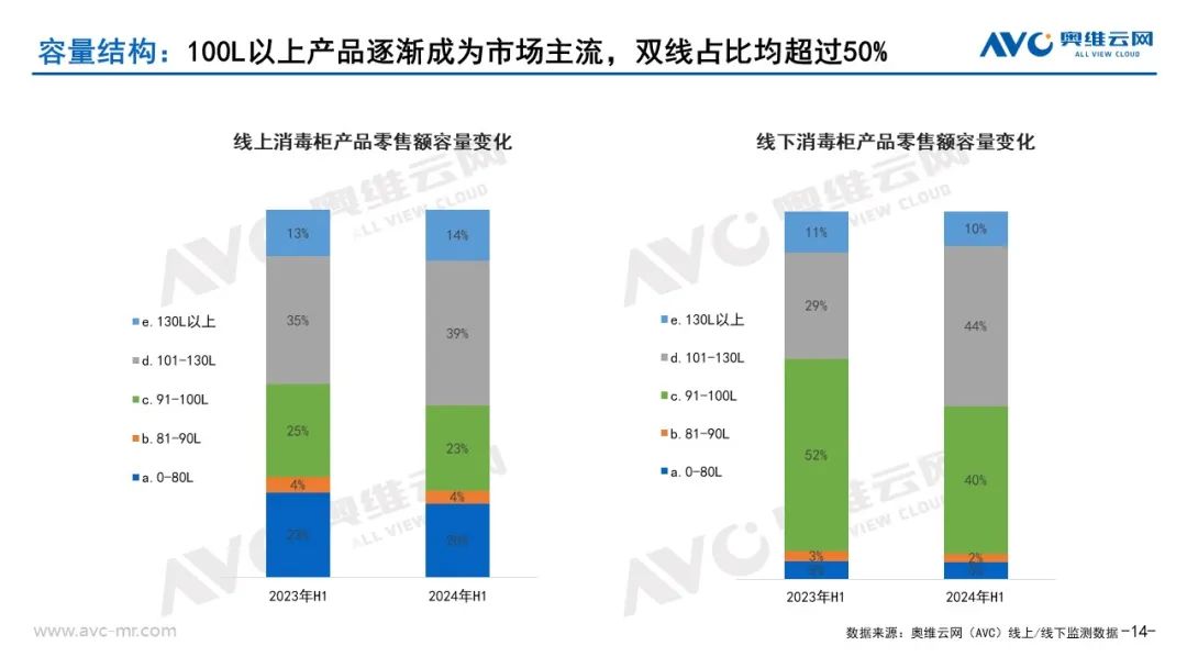 从套数与款式结构变化来看:大容量、嵌入式洗碗机占比继续提升。奥维云网(AVC)监测数据显示,2024年上半年100L以上消毒柜产品线上、线下市场销售额占比均有提升,线上市场100L以上消毒柜产品销售额占比53%,同比提升5%;线下市场100L以上消毒柜产品销售额占比54%,同比提升14%。从销售款式类型来看,嵌入式款消毒柜线上、线下市场销售额占比均有提升,线上市场销售额占比59%,提升3%;线下市场销售额占比86.2%,提升2.6%;市场继续向大容量、功能化细分方向发展。