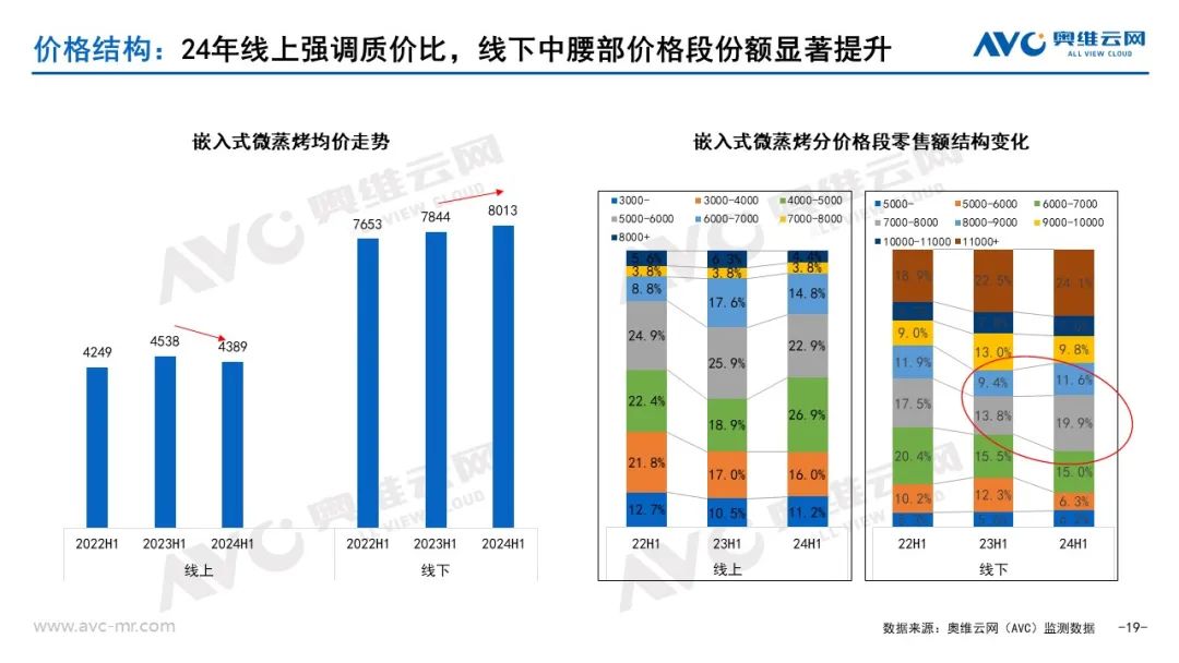 从价格结构看:2024年上半年线上市场更强调质价比,线下市场中腰部价格段份额显著提升。根据奥维云网(AVC)监测数据,2024年上半年嵌入式微蒸烤整体线上市场均价同比下滑149元。其中4000-5000元价格段零售额占比为26.9%,较同期增长8%;嵌入式微蒸烤整体线下市场均价同比增长169元。其中7000-8000元价格段零售额占比为19.9%,较同期增长6.1%。
