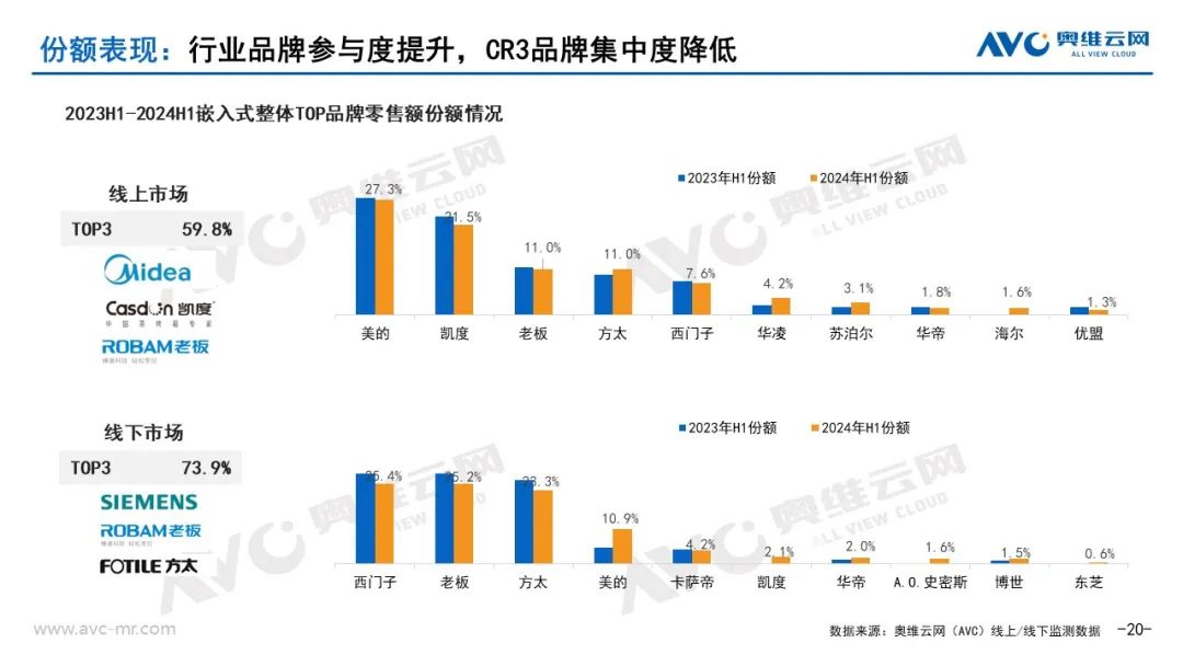 各品牌市场份额表现:2024年嵌入式微蒸烤市场企业参与度进一步提高,国内品牌竞争力大幅提升。奥维云网(AVC)监测数据显示,嵌入式微蒸烤整体线上市场CR3品牌占比59.8%,同比减少2.7%,方太、华凌、苏泊尔、海尔等品牌市场份额有所提升。线下市场CR3品牌占比73.9.同比减少9.7%,美的、凯度、华帝、博世、A.O.史密斯等品牌市场份额有所提升。